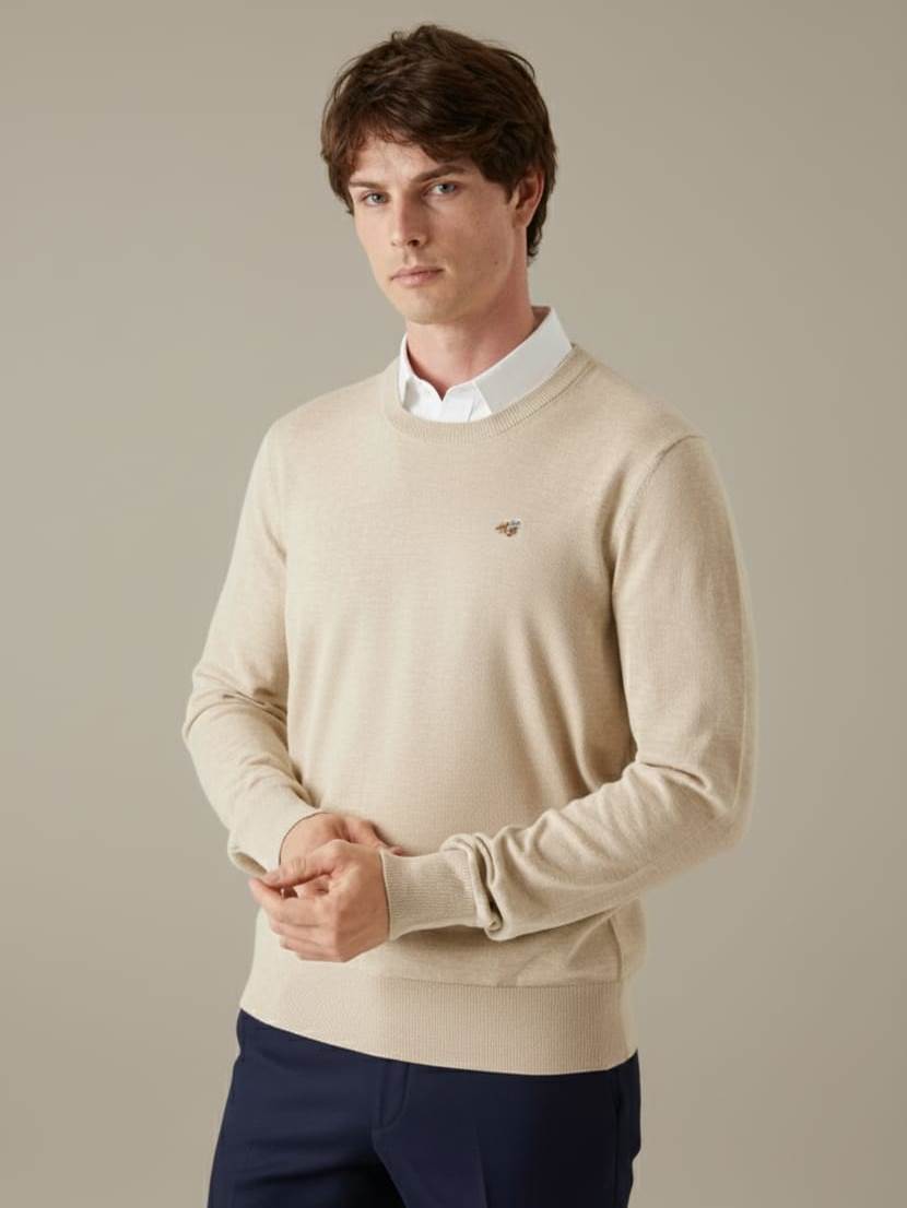 סוודר ארוג בצבע אבן פתח צואר עגול 100% כותנה מצרית סופימה לוגו פורור בחזה